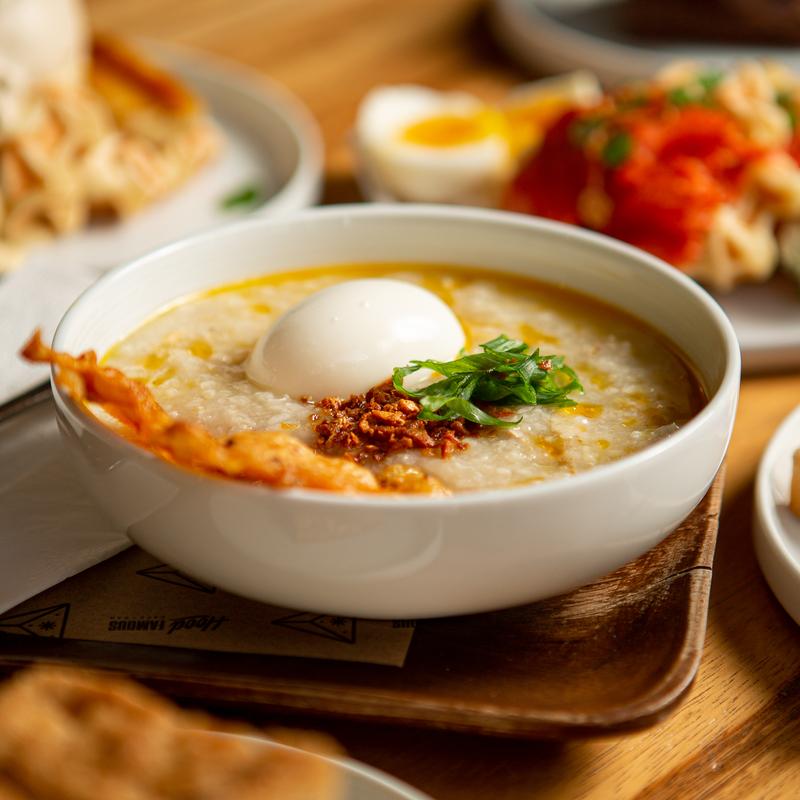 rice porridge, ginger, fish sauce, shredded Mary's chicken, fried garlic, achiote oil. +poached egg 2.5, +crispy chicken skin 3.8